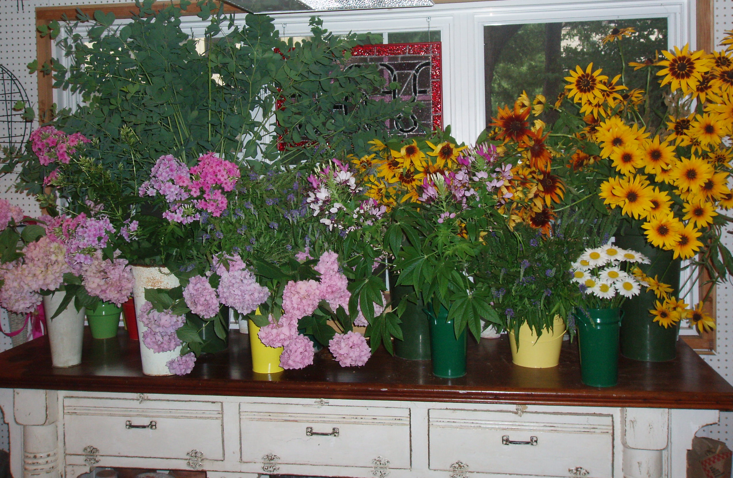Buckets of flowers cut from my garden waiting to be arranged.